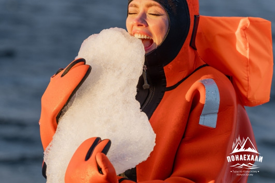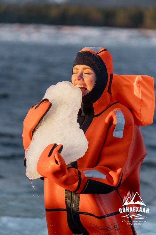 В оранжевых спас-костюмах, которые держат вас на воде. Вы сможете дурачиться, обнимать льдины или просто лежать и расслабляться, отдавая все напряжение Белому морю.
